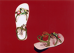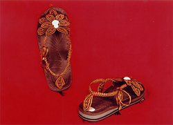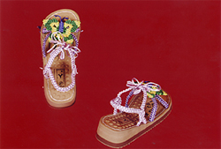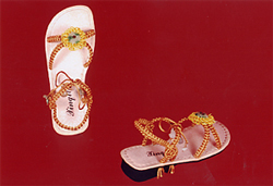 该产品属非文化遗产,纯手工制作,棉线编织而成。本人经多年潜心钻研,将传统的中国结结法来回变化编织出五光十色、形象逼真、精美绝伦的各种图案工艺活动鞋,形态分平面和立体两大类,近五十种图案,现已申报专利十九项。该产品纯棉线质,柔软舒适,新颖美观、实用,有高、中、底挡,适合男女老少各种人群。且每个图案还可配以水晶珠、彩珠、玛瑙、玉石珠等装饰,可编织出上百个不同颜色,图案、色彩无穷无尽,耐穿不易变形,经实践,三年不变形,不脱落,更可贵之外是鞋大小、松紧可自行调动,满足不同脚形所需,达到用户满意。