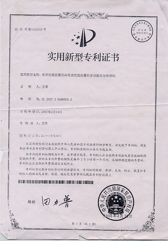 补充说明:本专利权人已研究成功,与手扶拖拉机,方向盘式农用四轮车配套使用的稻、麦两用联合收割机,辣椒、黄豆两用联合收割机,它的性能、特点、成本、效率与多功能花生收割机类同。经咨询国家有关权威部门证实,稻、麦两用联合收割机是当前比市场上正在使用的任何种类的稻、麦联合收割机的技术领先。收获辣椒填补了用机械收获辣椒的空白。